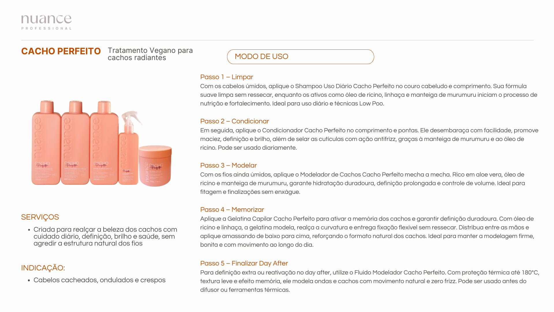 A linha Cacho Perfeito da Nuance Professional foi criada para realçar a beleza natural dos cabelos cacheados, ondulados e crespos, oferecendo um cuidado diário com alta performance. Sua fórmula 100 por cento vegana, sem sulfatos agressivos, sem parabenos e sem petrolatos, garante hidratação profunda, definição, maciez e movimento. Ideal para quem busca um tratamento consciente, eficaz e com resultado profissional.