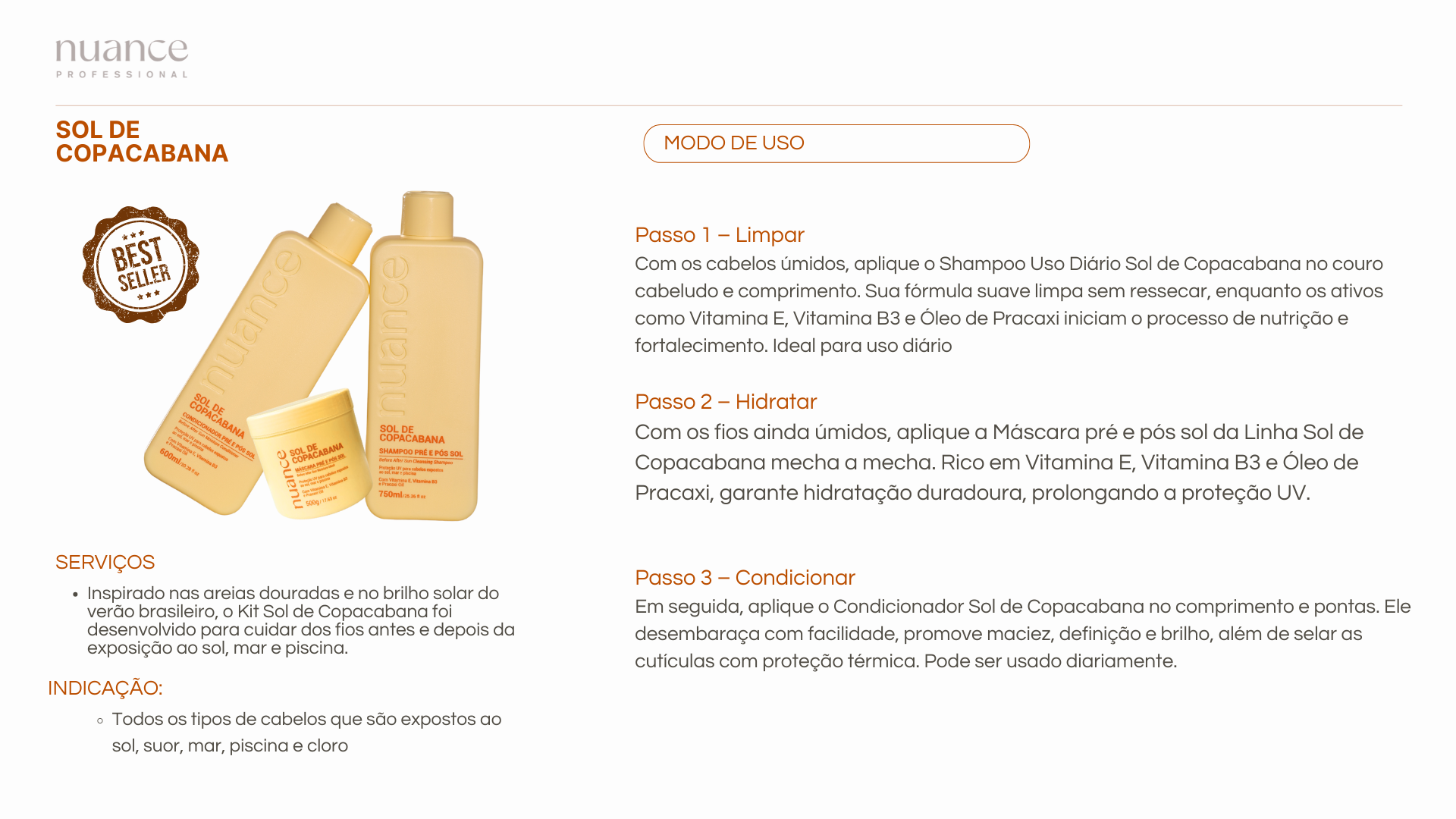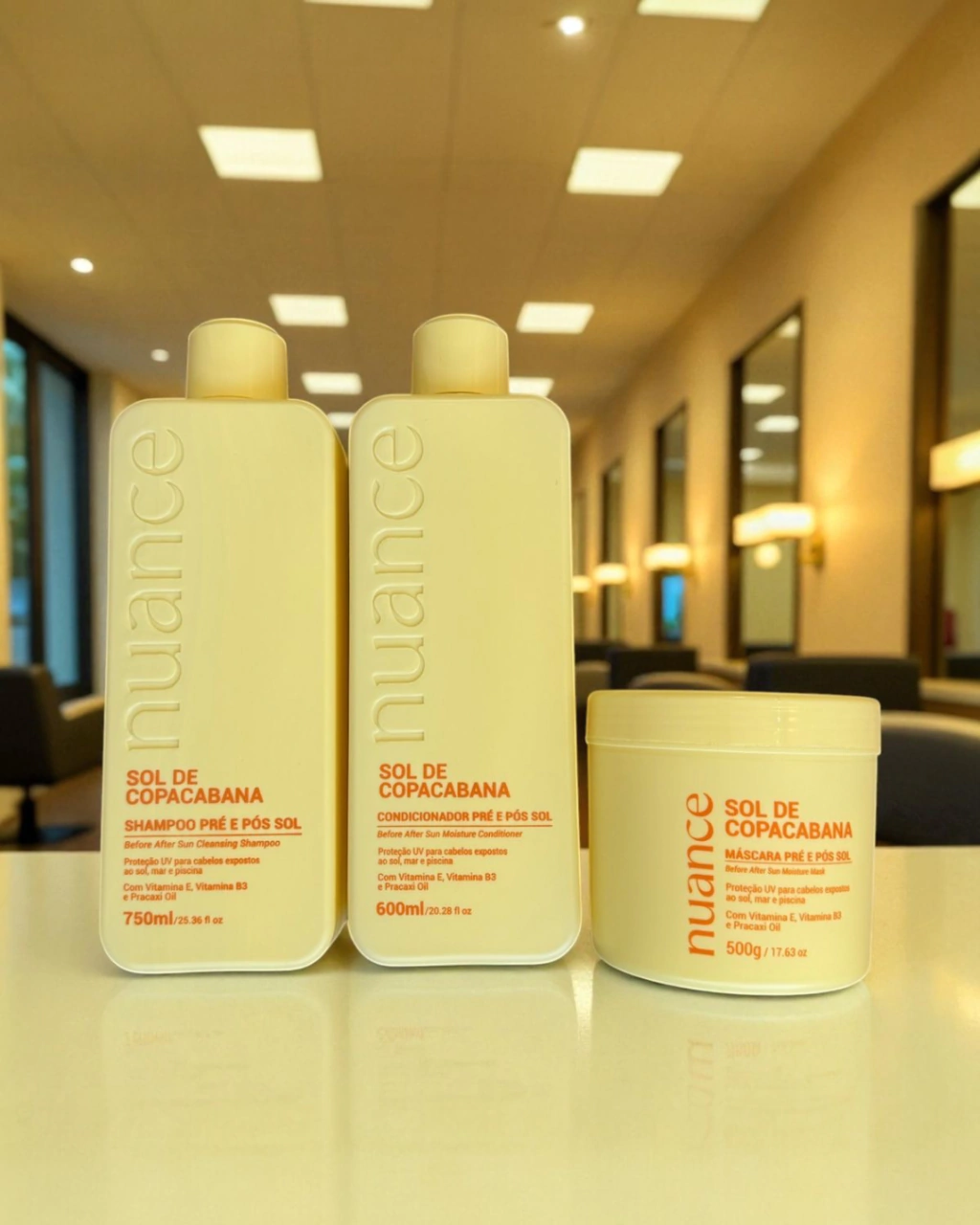 O Kit Sol de Copacabana Nuance Professional é o cuidado completo para quem ama sol, praia, mar, piscina e vida ao ar livre. Criado para proteger, nutrir e restaurar os fios antes e depois da exposição ao sol, o kit combina três produtos poderosos que devolvem maciez, brilho e resistência. É também o kit queridinho das esportistas que treinam sob o sol e precisam de um tratamento diário confiável para manter o cabelo saudável e bonito.